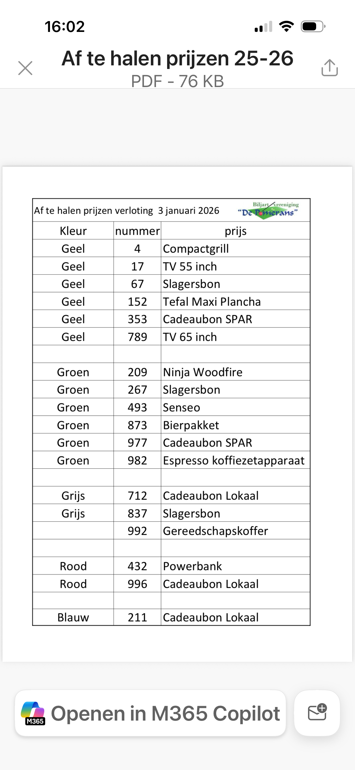 Ik heb ook de lijst met nog af te halen prijzen als bijlage bijgevoegd.
